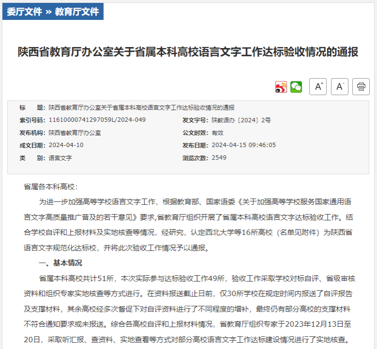 近日,陕西省教育厅办公室发布了《关于省属本科高校语言文字工作达标验收情况的通报》,结合学校自评和上报材料及实地核查等情况,研究认定了西北大学等16所高校(名单见附件)为陕西省语言文字规范化达标校,我校名列其中。