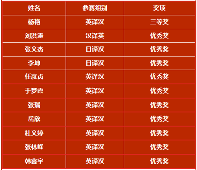 10月17日,第三十五届韩素音国际翻译大赛获奖名单揭晓。西译学子在本届比赛中表现出众,荣获了多个奖项,其中“英译汉”组三等奖1名,优秀奖7名;“汉译英”组优秀奖1名;“日译汉”组优秀奖2名;我校也荣评“优秀组织奖”称号。这是我校参加本项大赛以来取得的最好成绩。